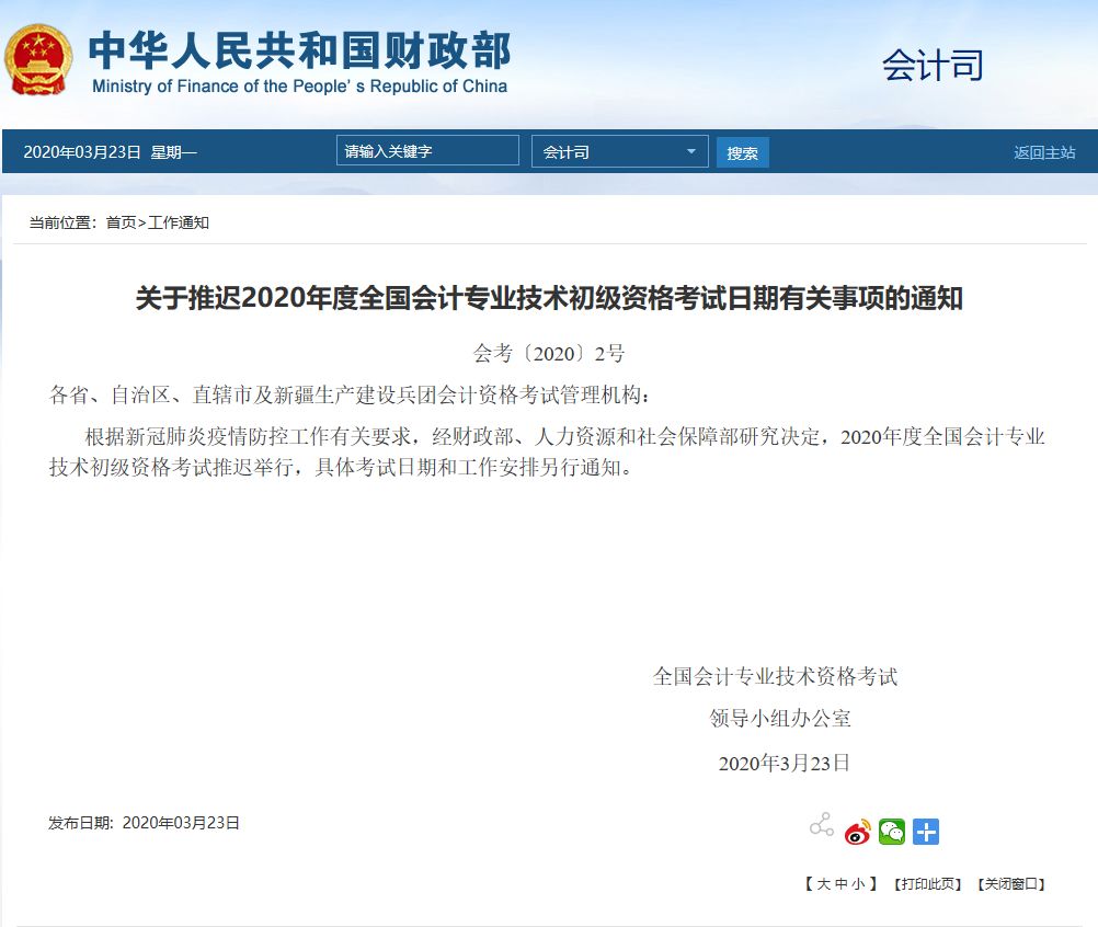 重磅消息!财政部发文确定2020年初级会计职称考试推迟!具体考试日期和工作安排另行通知。